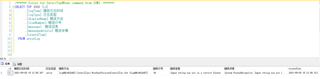 运行项目后我们查询一下数据库,发现捕捉到错误信息了,包括