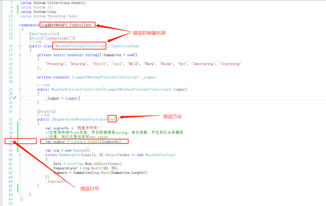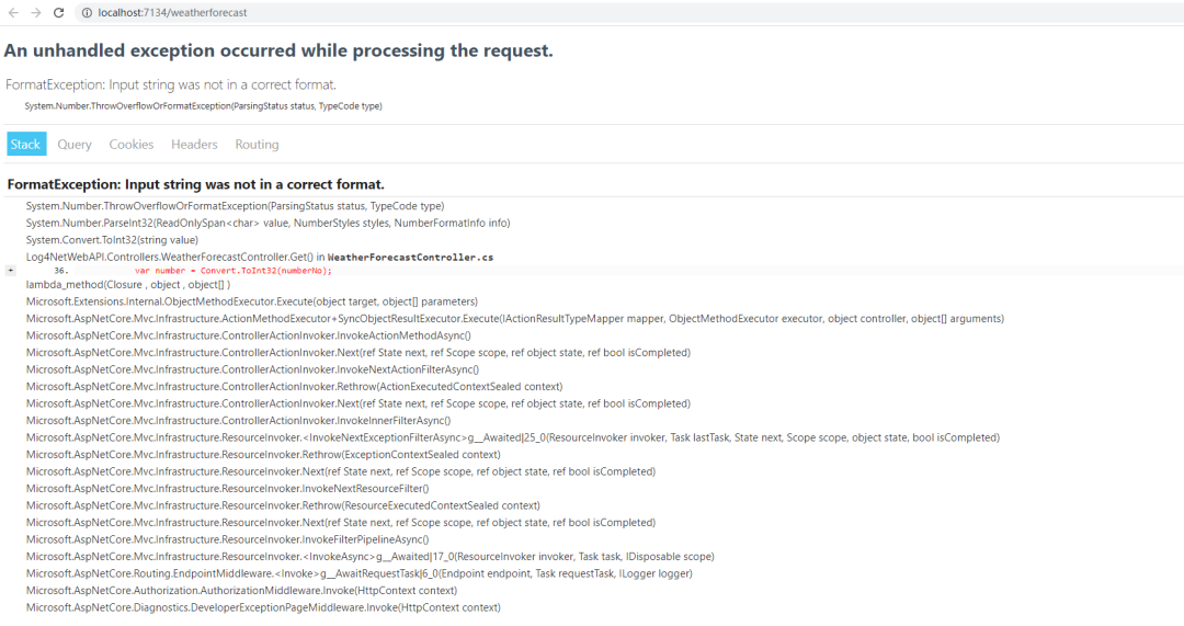 错误的方法位置:Log4NetWebAPI.Controllers.WeatherForecastController.Get (Log4NetWebAPI),
