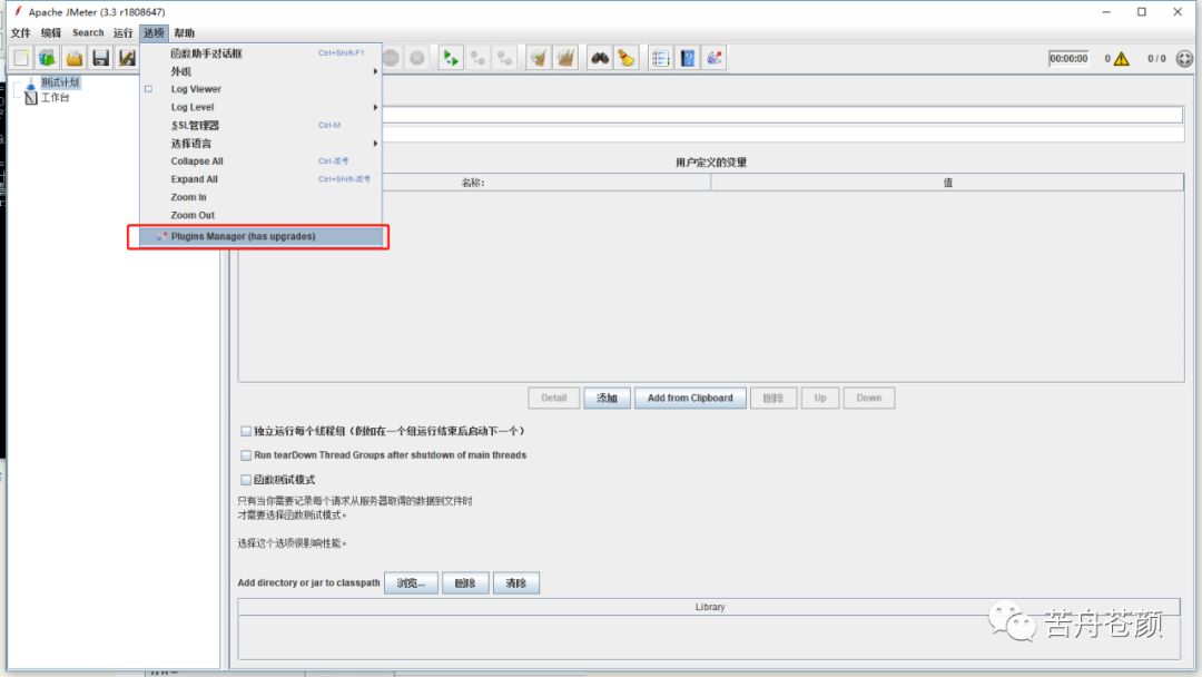 2. 点击“选项-Plugins Manager”。如果没有Plugins Manager,就需要到官网下载Plugins Manager的jar包进行安装:https://jmeter-plugins.org/wiki/PluginsManager/。
