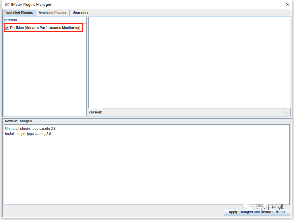 3. 搜索并安装perfmon插件,安装完成会自动重启jmeter。也可以从官网下载perfmon插件自己安装:https://jmeter-plugins.org/?search=jpgc-perfmon