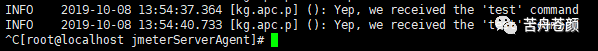 6. 验证server agent 安装是否成功。在JMeter压力机使用telnet像ServerAgent发送“test”,如telnet 192.168.18.10 4444,连通后,输入test,正常情况下ServerAgent会输出类似INFO 2019-10-08 13:54:40.733 [kg.apc.p] (): Yep, we received the 'test' command的日志。注:有可能如果压力机是Windows系统,有可能没有安装telnet工具,需要去“程序和功能-启用或关闭Windows功能”中开启。