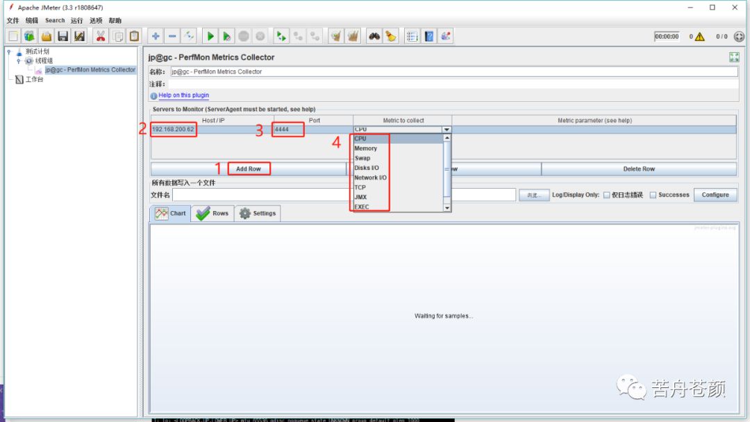 2.在perfmon监听器中点击“Add Row”添加监控项。每个监控项需要配置服务器ip、server agent 端口、监控项。