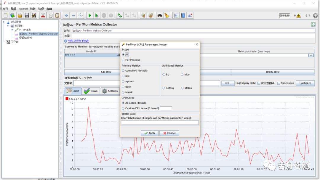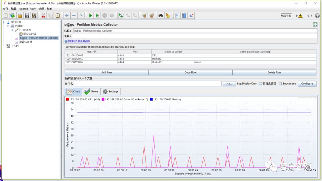 在线程组下面添加一个http取样器,再添加一个查看结果树、固定定时器,设置循环,然后运行。查看perfmon监听器,即可看到监控指标的图示。