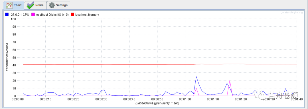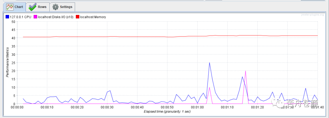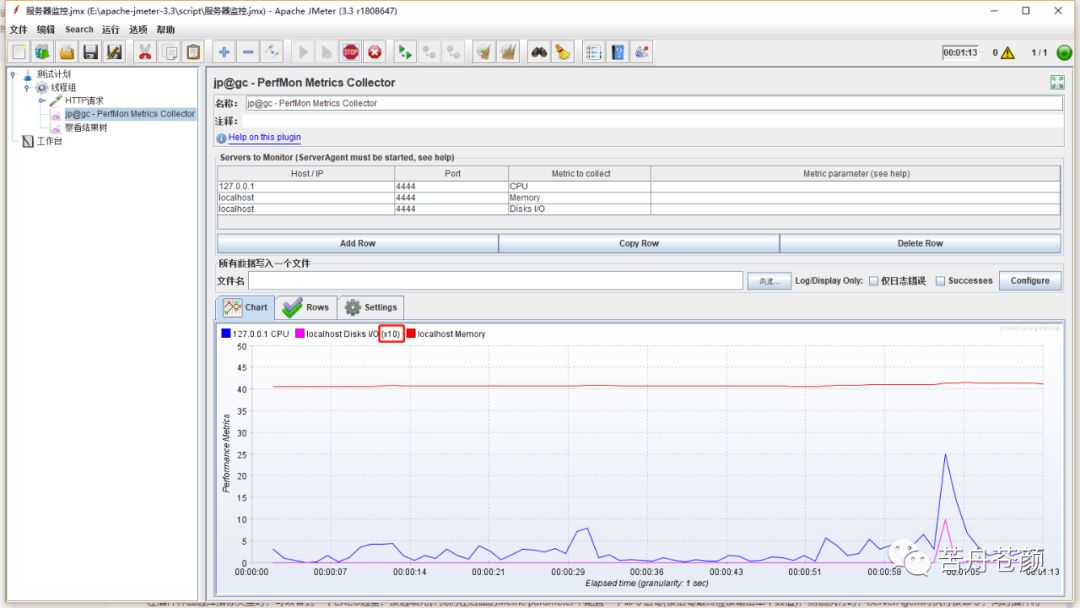 当一个PerfMon监听器中展示多种指标项的数据时,为了曲线图的可观察性,插件会自动进行优化,如图5所示,我们看到在磁盘读写监控项后面有个x10,代表曲线图中展示的数值是在采集到的真实数值上放大了10倍,目的是为了保证不同数据项在同一坐标系中展示时,各项都变化趋势都能够被观察到。
