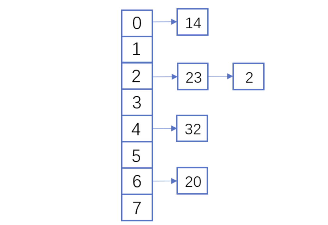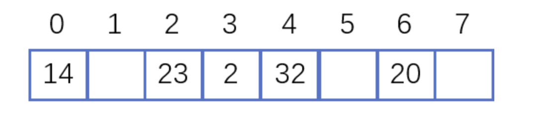 假设散列长为8,散列函数H(K)=K mod 7,给定的关键字序列为{32,14,23,2, 20}