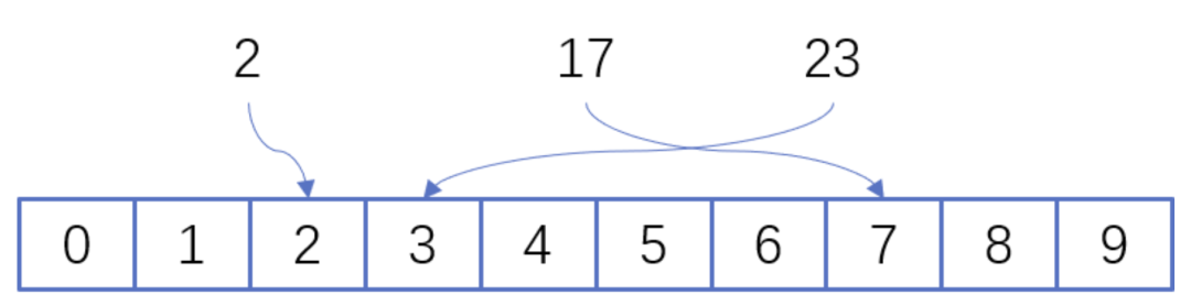 这里的两种算法的区别是2这个元素,在链表法中还是在节点2的位置上,但是在线性探测法遇到冲突时会将冲突数据放到下一个空的位置下面。