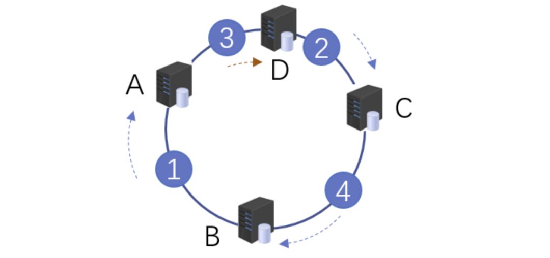 同样的,我们进行了服务器扩容以后,新增了一台服务器D,位置落在用户2和3之间。按照顺时针原则,用户2依然访问的是服务器C的数据,而用户3顺时针查询后,发现最近的服务器是D,后续数据就会存储到d上面。