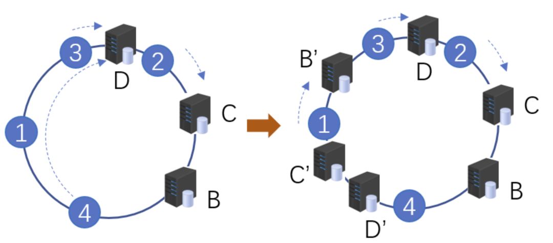 如右图所示,B、C、D 是原始节点复制出来的虚拟节点,原本都要访问机器D的用户1、4,分别被映射到了B,D。通过这样的方式,起到了一个服务器均匀分布的作用。