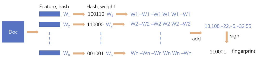 对每个feature_weight_pairs中的feature进行hash。然后对hash_weight_pairs进行位的纵向累加,如果该位是1,则+weight,如果是0,则-weight,最后生成bits_count个数字,大于0标记1,小于0标记0