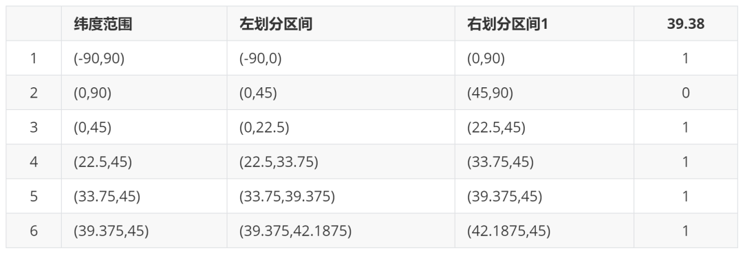 地球纬度区间是[-90,90],对于这个区间进行二分划分左区间[-90,0), 右区间[0,90]。39.3817属于右区间,标记为1