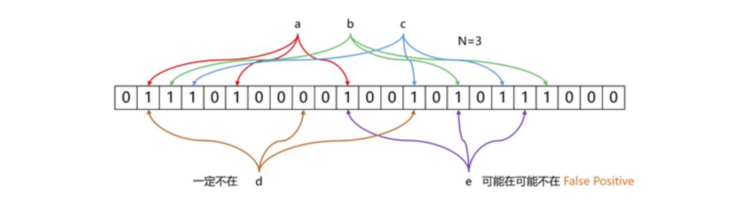 上图所示的例子中,数据a、b、c经过三次hash映射后,对应的bit位都是1,表示这三个数据已经存在了。而d这份数据经过映射后有一个结果是0,则表明d这个数据一定没有出现过。布隆过滤器存在假阳率