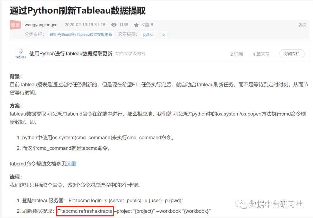 在搜索“Tableau python”关键字后,功夫不负有心人,找到一篇文章《