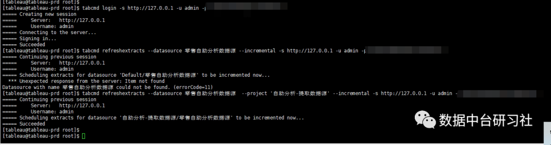 根据这篇文章的提醒,我发现数据源的刷新时通过命令行来实现的,由于我们的调度环境和Tableau安装在不同的服务器,加之二者可以通过ssh打通,所以我准备用ssh+tabcmd命令来实现这个功能。