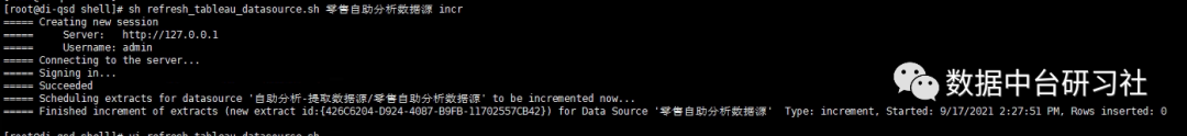 vi refresh_tableau_datasource.sh#!/bin/bash## @auther wcb## 程序功能:主动请求刷新tableau自主分析数据源# 使用方式# eg: ./refresh_tableau_datasource.sh xx自助分析数据源 [incr/all]set -e;if [ ! -n "$2" ]; thenecho "Invalid arguments. Usage: sh refresh_tableau_datasource.sh xx自助分析数据源 [incr/all]"exit -1elsedatasource=$1;refreshtype=$2;fiif [ $refreshtype = "incr" ]; thenssh tableau@192.168.5.11 "tabcmd refreshextracts --datasource ${datasource} --project '自助分析-提取数据源' --incremental --synchronous -s http://127.0.0.1 -u admin -p xxx"elif [ $syscode = "all" ]; thenssh tableau@192.168.5.11 "tabcmd refreshextracts --datasource ${datasource} --project '自助分析-提取数据源' --synchronous -s http://127.0.0.1 -u admin -p xxx"elseecho "第一个参数不正确。刷新方式仅支持 incr--增量/all 全量"fi