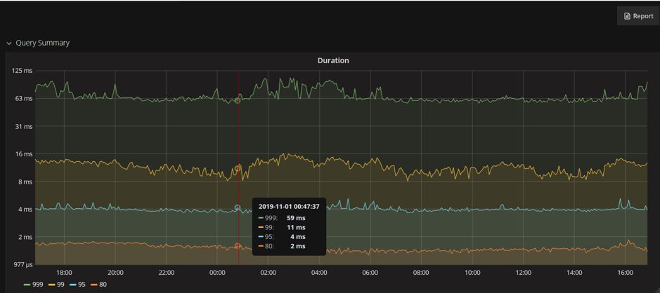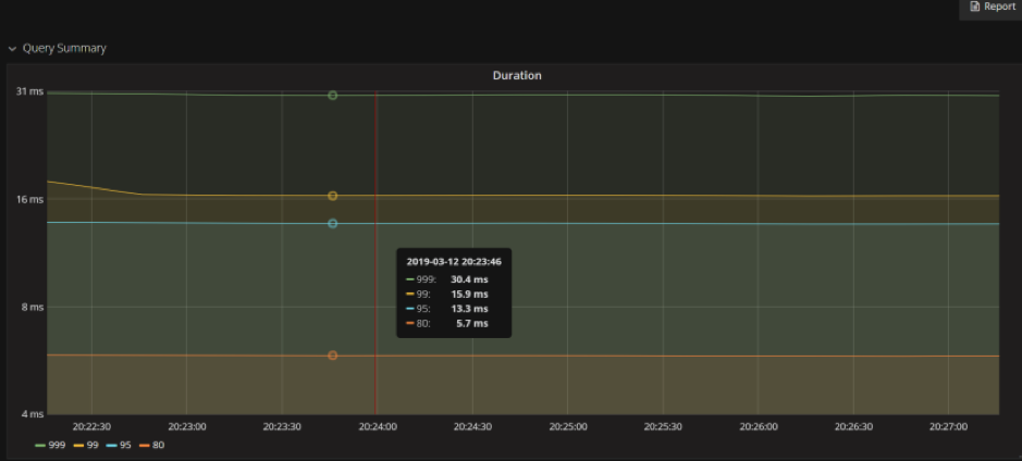 1. OLTP 测试:2000 万数据,500 并发线程测试,在 OLTP 场景测试下 TiDB 的响应时间 99% 在 16ms 以内,满足业务需求。且在数据量级越来越大的情况下,TiDB 会体现出更大的优势,后续还可以通过添加 TiDB/PD/TiKV 节点来提高读写性能,如下图所示: