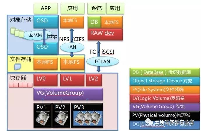 我们从底层往上看,最底层就是硬盘,多个硬盘可以做成RAID组,无论是单个硬盘还是RAID组,都可以做成PV,多个PV物理卷捏在一起构成VG卷组,这就做成一块大蛋糕了。接下来,可以从蛋糕上切下很多块LV逻辑卷,这就到了存储用户最熟悉的卷这层。到这一层为止,数据一直都是以Block块的形式存在的,这时候提供出来的服务就是块存储服务。你可以通过FC协议或者iSCSI协议对卷访问,映射到主机端本地,成为一个裸设备。在主机端可以直接在上面安装数据库,也可以格式化成文件系统后交给应用程序使用,这时候就是一个标准的SAN存储设备的访问模式,网络间传送的是块。