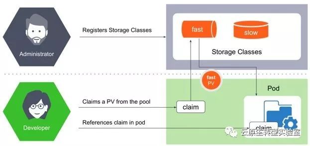 动态配置是通过StorageClass完成的。集群管理员不需要预先手动创建PV,而是创建多个存储配置文件,就像模板一样。当开发人员创建PVC时,根据请求的要求,其中一个模板在请求时创建,并附加到Pod。