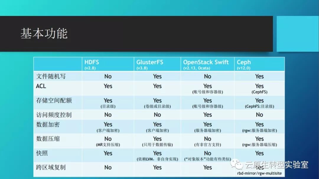 GlusterFS是Red Hat旗下的一款开源分布式文件系统,它具备高扩展、高可用及高性能等特性,由于其无元数据服务器的设计,使其真正实现了线性的扩展能力,使存储总容量可轻松达到PB级别,支持数千客户端并发访问;对于跨集群,其强大的Geo-Replication可以实现集群间数据镜像,而且是支持链式复制,这非常适用于垮集群的应用场景。