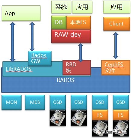 1)Ceph底层存储是基于RADOS(可靠的、自动的分布式对象存储),它提供了LIBRADOS/RADOSGW/RBD/CEPH FS方式访问底层的存储系统,如上图所示;