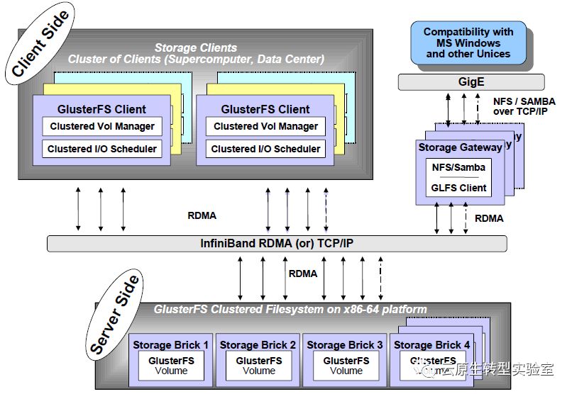 GlusterFS总体架构与组成部分如上图所示,它主要由存储服务器(Brick Server)、客户端以及NFS/Samba存储网关组成。不难发现,GlusterFS架构中没有元数据服务器组件,这是其最大的设计这点,对于提升整个系统的性能、可靠性和稳定性都有着决定性的意义。GlusterFS支持TCP/IP和InfiniBand RDMA高速网络互联,客户端可通过原生Glusterfs协议访问数据,其他没有运行GlusterFS客户端的终端可通过NFS/CIFS标准协议通过存储网关访问数据。