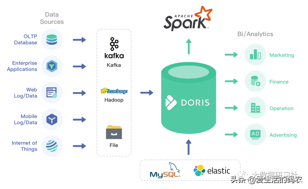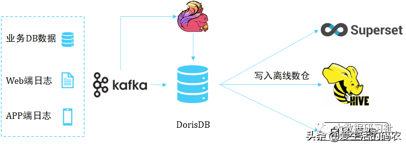 业务DB数据(主要是MySQL,可以使用Canal+Kafka的方式将MySQL数据实时同步到DorisDB)、日志数据(APP、Web和H5小程序等埋点数据,通过Flume写入到Kafka)