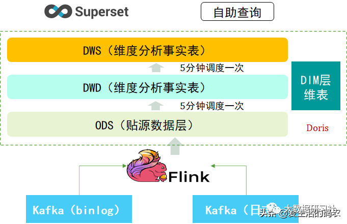 基于DorisDB的实时数据仓库总体架构如下,主要分成3个部分: