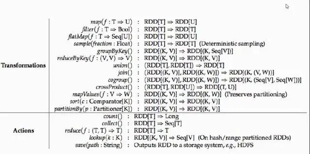 RDD有两种类型的算子操作。一种是TransFormation这种只记录逻辑关系的转型型算子,一种是Action这种基于一个数据集进行运算的计算算子。比如,Map是一个TransFormation算子,Map将数据集的每一个元素按指定的函数转换为一个RDD返回。而Reduce是一个Action算子。