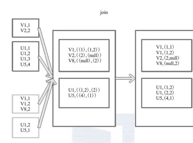 用于操作两个键值对格式的数据集,操作两个数据集(K,V)和(K,W)返回(K, (V, W))格式的数据集。通过leftOuterJoin、rightOuterJoin、fullOuterJoin完成外连接操作。