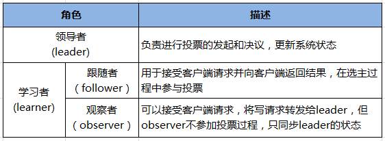 学习者(learner),包括跟随者(follower)和观察者(observer)。 跟随者(follower),用于接受客户端请求、向客户端返回结果,在选主过程中参与投票。