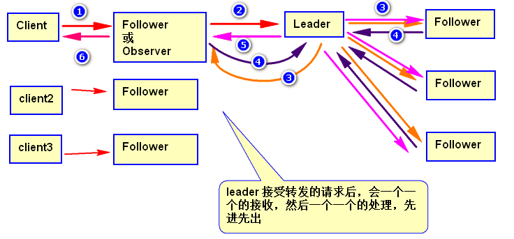2)Follwer 或 Observer 把请求发送给Leader;