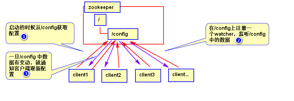 发布与订阅即所谓的配置管理,顾名思义就是将数据发布到ZK节点上,供订阅者动态获取数据,实现配置信息的集中式管理和动态更新。