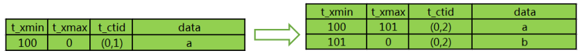 上图代表该元组被xid=102的事务删除,将t_xmax设置为删除事务的xid,t_ctid指向自己。