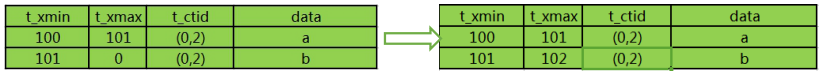 上图中左边是一条新插入的元组,可以看到元组是xid=100的事务插入的,没有进行更新,所以t_xmax=0,同时t_ctid指向自己,0号页面的第一号元组。右图是发生xid=101的事务更新该元组后的状态,更新在pg里相当于插入一条新元组,原来的元组的t_xmax变为了更新这条事务的xid=101,同时t_ctid指针指向了新插入的元组(0,2),0号页面第二号元组,第二号元组的t_xmin=101(插入该元组的xid),t_ctid=(0,2),没有发生更新,指向自己。
