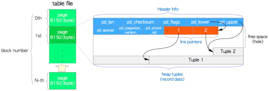 3.heap tuple:存放真实的元组数据,注意元组是从页面的尾部向前堆积的,元组和行指针之间的是数据页的空闲空间。