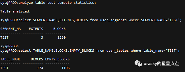 TEST表初始分配了10M的空间,可以看到有3个EXTENTS,1280个BLOCKS。USER_TABLES视图显示有0个使用的BLOCKS,1280个空闲BLOCKS,即该10M空间内的BLOCK都还没被ORACLE”格式化”。