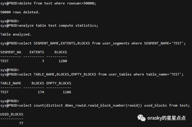 删掉一半数据后,仍然显示使用了174个BLOCKS,高水位没变。但查询真正使用的BLOCK数只有77个。所DELETE操作是不会改变HWM的。