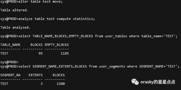MOVE之后,HWM降低了,空闲块也上去了,但是分配的空间并没有改变,仍然是1280个BLOCKS。