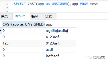 从结果上我们可以看到 app 转换之后的结果只有 0123asfj 转换成了123,其他都是0。所以在查询条件为 ‘!=0’ 的时候就只能查询到一条结果。