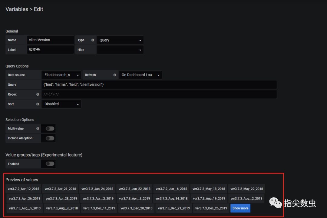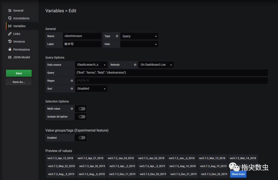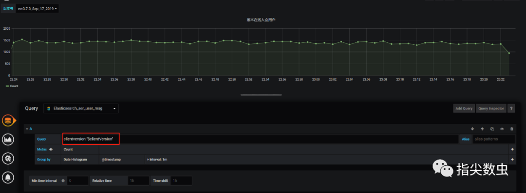 首先新建一个图表。基于自己的业务选择相关数据源与图表类型等。 我们之前创建的variables叫做clientVersion,直接可以通过&clientVersion进行变量的引用。例如: