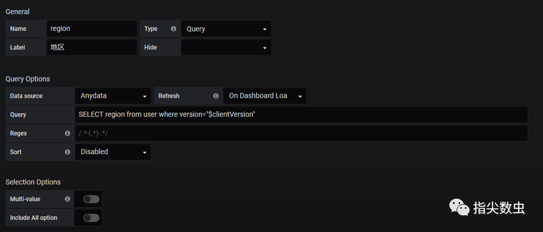 Refresh表示变量的刷新时间,有三种时间选择 Never:设置后用不刷新 On Dashboard Load:Dashboard重新加载的时候刷新一次。 On Time Range Change:跟随Dashboard的刷新时间进行刷新。Dashboard右上角。 Selection Options Multi-value: 多选 Include All option:是否包含所有(会增加一个ALL的变量)