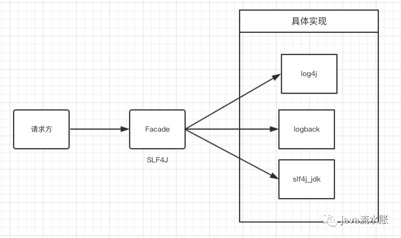 SLF4J就是典型的门面模式,先说下什么是门面模式,简单说系统访问入口SLF4J只提供一个门面,具体实现对调用方不可见,SLF4J门面模式如下图。
