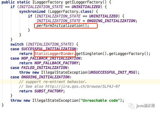 LoggerFactory的getLoggerFactory实现如下图:记住StaticLoggerBinder这个关键字,这是SLF4J门面模式的核心(如果没有具体SLF4J实现时,这里会出现找不到实现类的红色标示)。