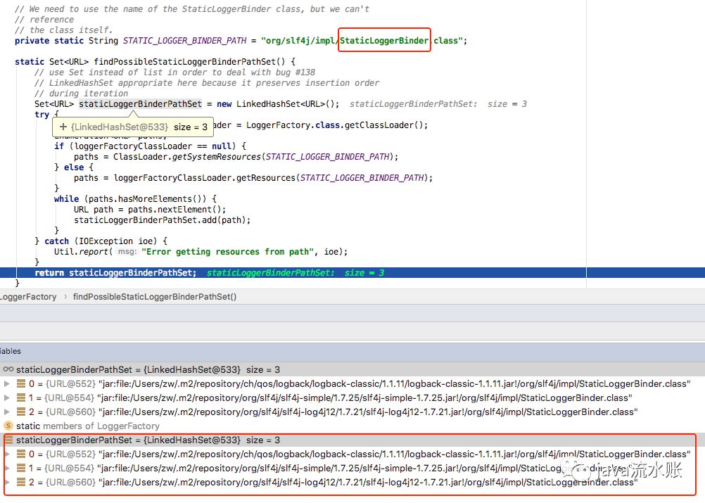 如果系统中有多个SLF4J实现时,debug进去,ClassLoader.getResources()方法会从ClassPath查找到多个StaticLoggerBinder的实现类,如下图所示: