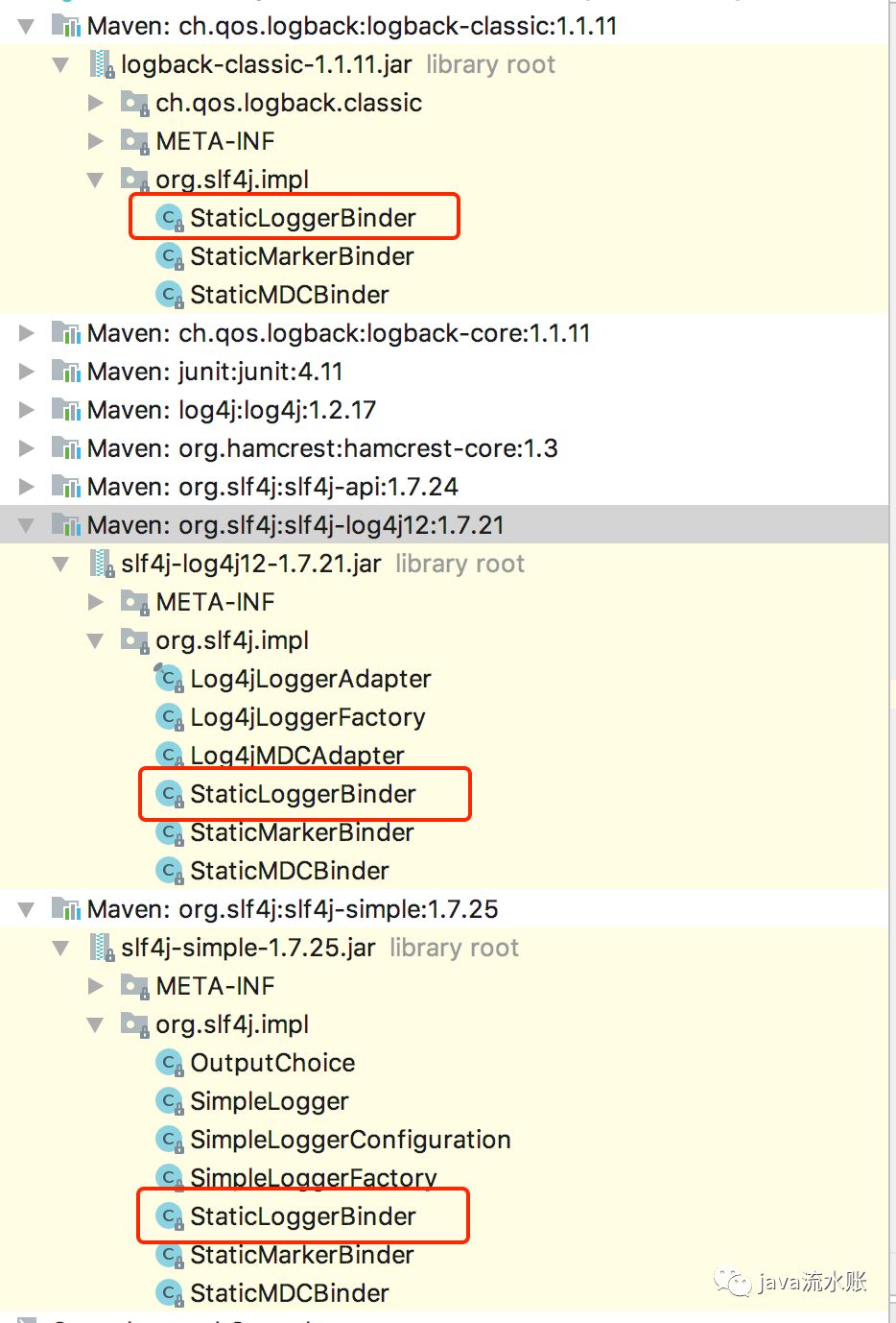 所有实现SLF4J标准的日志系统都需要提供StaticLoggerBinder类,如下图所示: