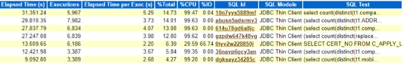 select count(distinct(t1.company)) from V_xxxx_USER t1, V_xxxx_APPLY t2where t1.id = t2.id and t1.cert_no = :1and t2.insert_time > sysdate – 90