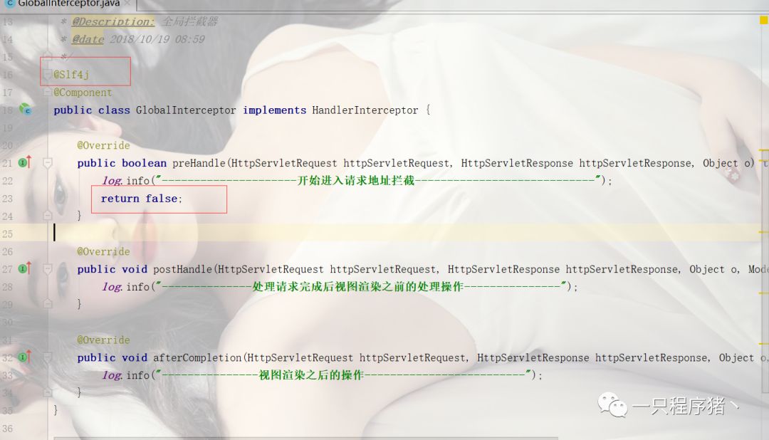 接着我们开始创建我们本章需要的类和配置信息。(这里关注一下我的@SLF4J注解信息,和return false操作)