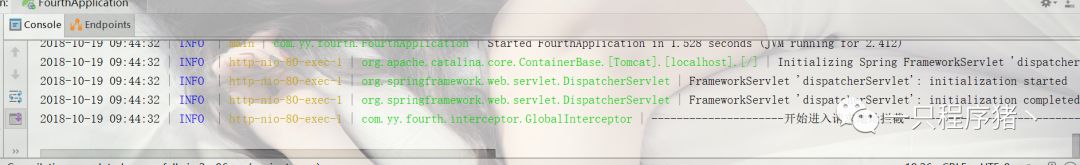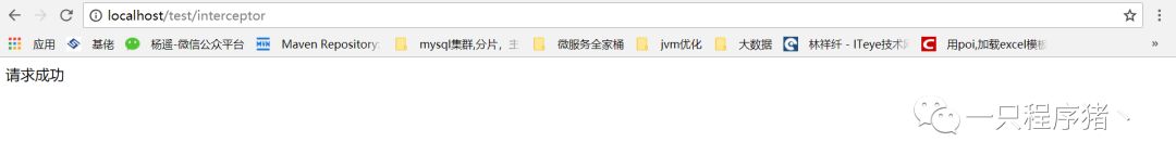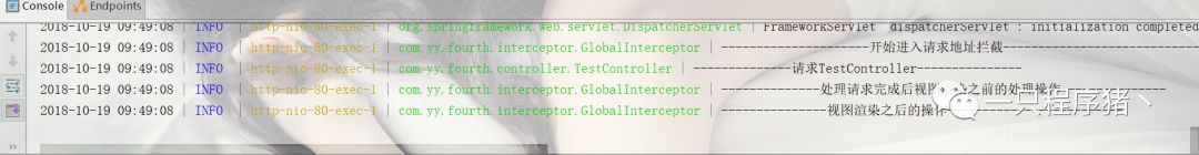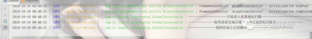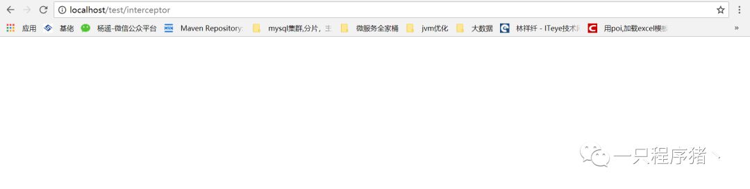 现在我们启动项目看看,页面什么都没有,并且我们看看控制台日志信息只打印了一句话,这是什么原因呢?这就是我们之前吧拦截器设置为return false,程序不会继续往下执行。我们修改为return true试试。