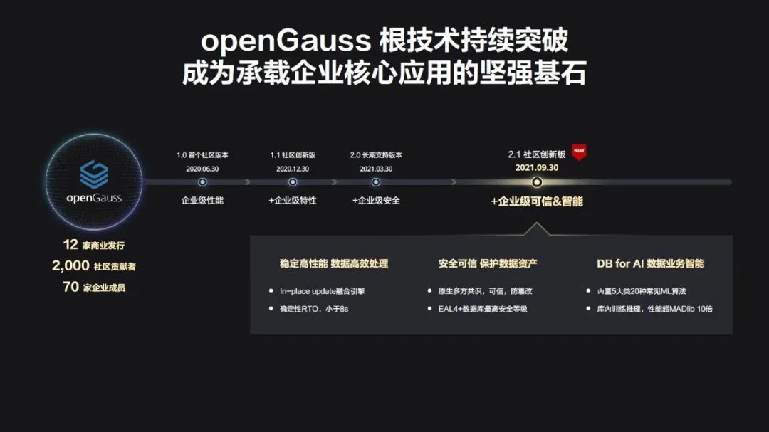 9月25日,在华为全联接2021大会上,华为计算产品线总裁邓泰华发表了“深耕数字化,共筑数字技术新生态”的主题演讲,分享了openGauss自去年六月底开源以来的成果。目前,已有70企业伙伴加入社区,开发贡献者超过2000人,有12家伙伴基于openGauss发布了商业发行版,其中海量数据、云和恩墨、神舟通用等伙伴产品已经在金融、政府、电力、制造等行业规模应用,逐步进入到大规模推广。