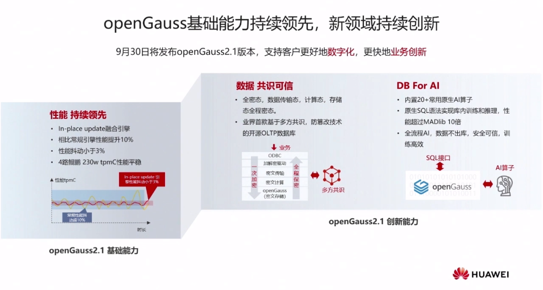 华为计算产品线总裁邓泰华展示了在9月30日即将发布的openGauss2.1创新版本中,openGauss在内核特性方面的重大升级,使能DBV伙伴们,抓住全行业数据库规模化商用部署的机遇。