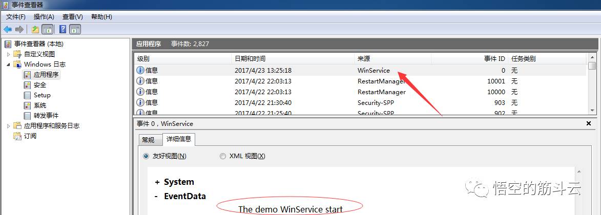 我们打开事件查看器看看我们记录的系统消息是否正常,同样地,我们暂停服务或者重启服务都会记录我们代码里面logMessage的消息